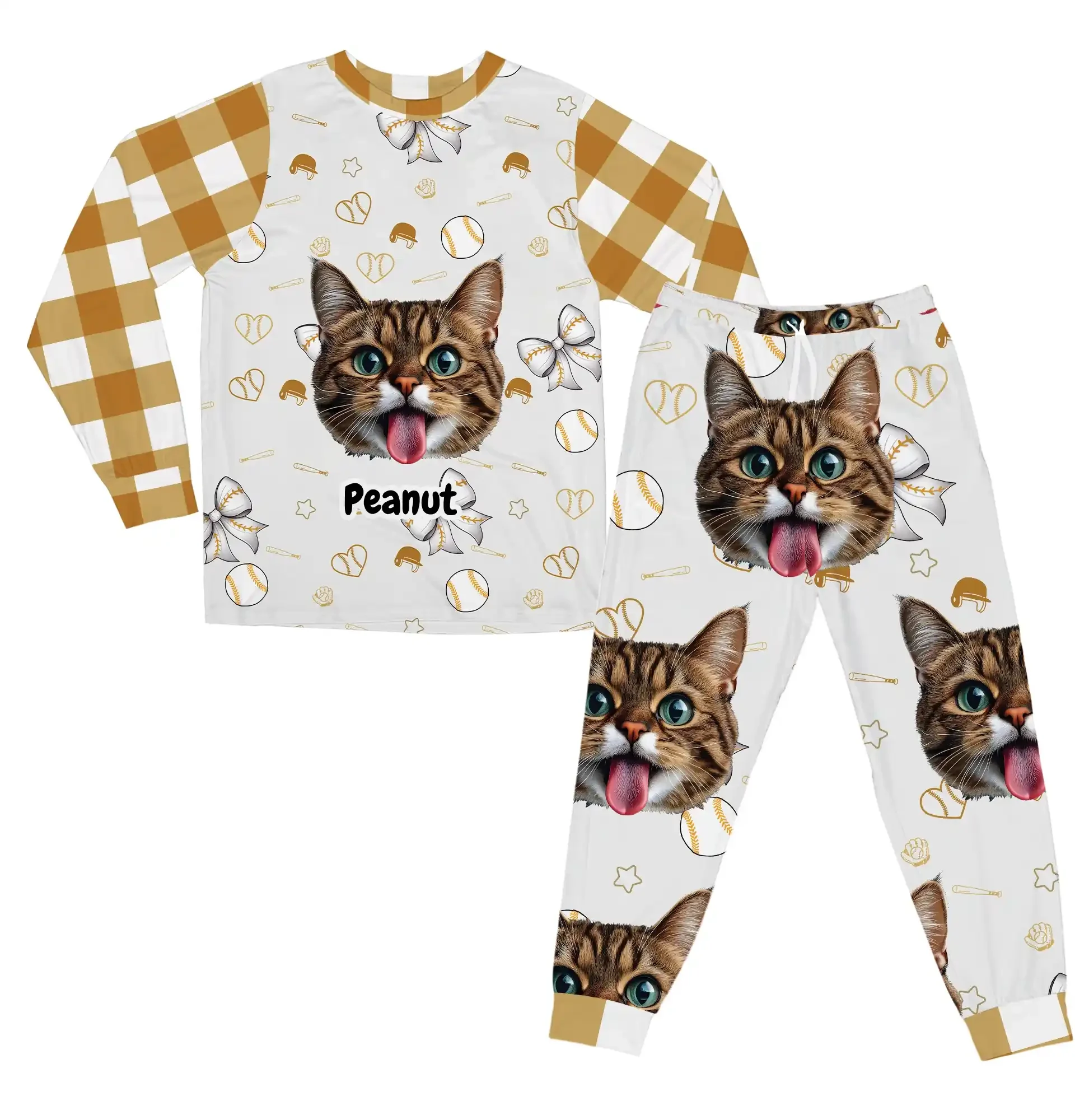 • Charming & Cohesive Design: This set is a masterclass in coordination. It features a stylish golden-brown and white gingham pattern on the sleeves, waistband, and ankle cuffs. This warm, earthy tone is perfectly mirrored in the delicate, tossed pattern on the main white fabric, which includes baseballs, bats, hearts, and bows, creating a unified and fashionable look.