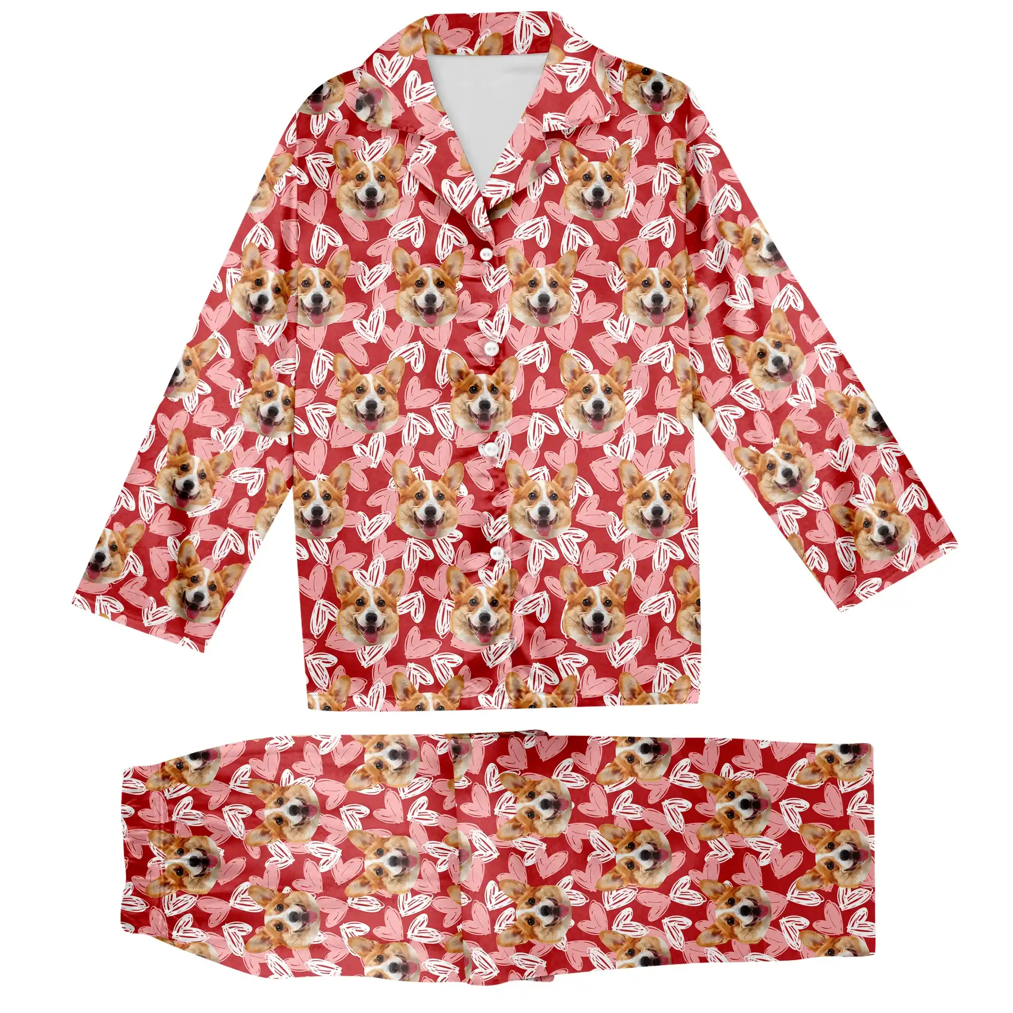 Wrap yourself in comfort and love with our exclusive Custom Dog Face Pajamas with Hearts | Personalized Dog PJ Set. This eye-catching set features your pet’s adorable face repeating across a vibrant red background, perfectly coordinated with a playful mix of soft pink and white illustrated hearts. It’s the ultimate personalized lounge-wear for pet lovers.