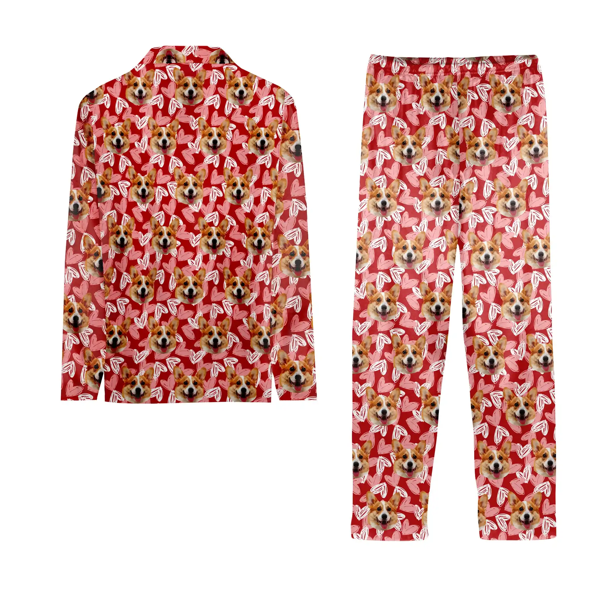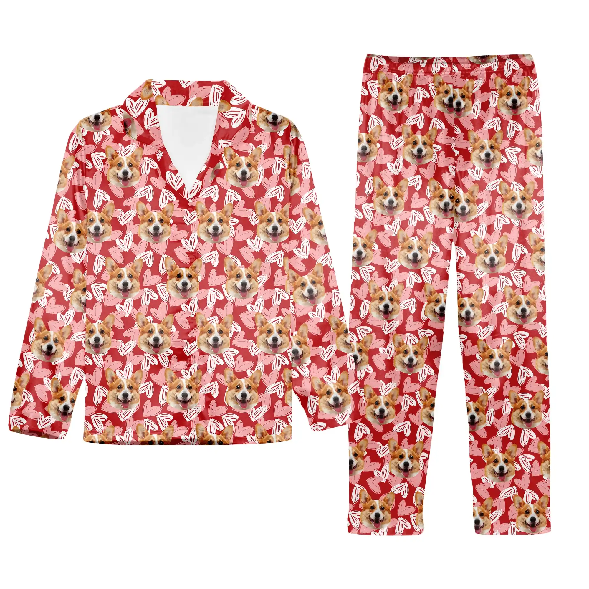 - Vibrant & Coordinated Color Palette: The pajamas use a bold, passionate red as the base, a color often associated with love and warmth. This vibrant hue makes the entire design pop and feels incredibly cozy and loving. It serves as the perfect backdrop, allowing the custom elements to shine. This coordinated color choice highlights both your pet’s photo and the decorative hearts, ensuring your personalized design is the undisputed star of the show.