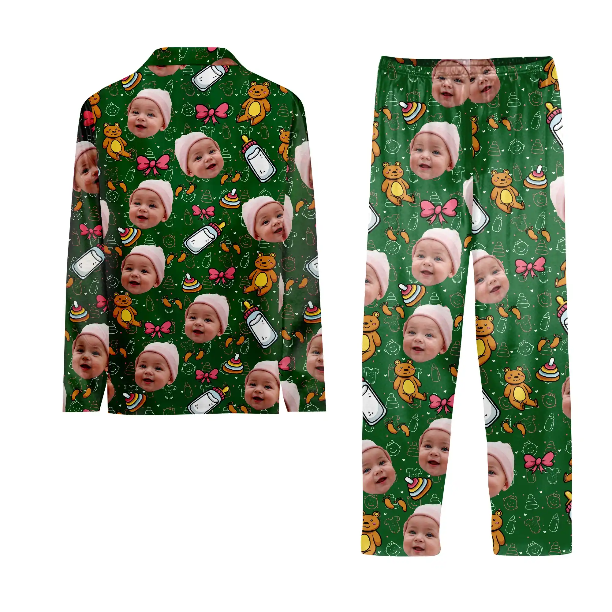 Celebrate your little one with our “Custom Pajama Set with Baby Face & Toys | Personalized Photo PJs”. This charming set features your baby’s face nestled among a playful pattern of toys on a rich green background. The coordinated design, blending adorable motifs with vibrant colors, creates a unique and heartwarming garment.